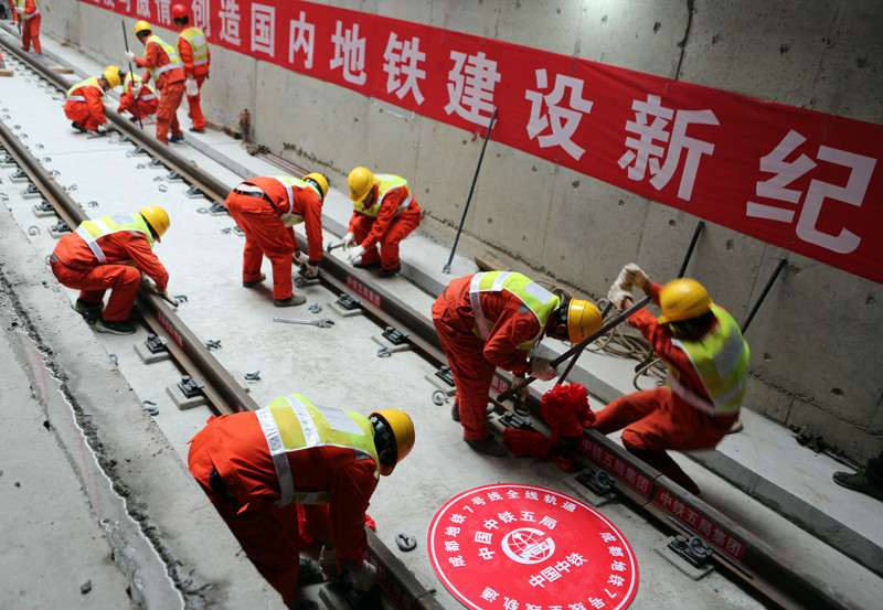 12月18日上午,成都地鐵茶店子站右線最后一組25米軌排鋪設(shè)完成,宣告成都中心城區(qū)首條環(huán)形地鐵線路7號線全線軌通。